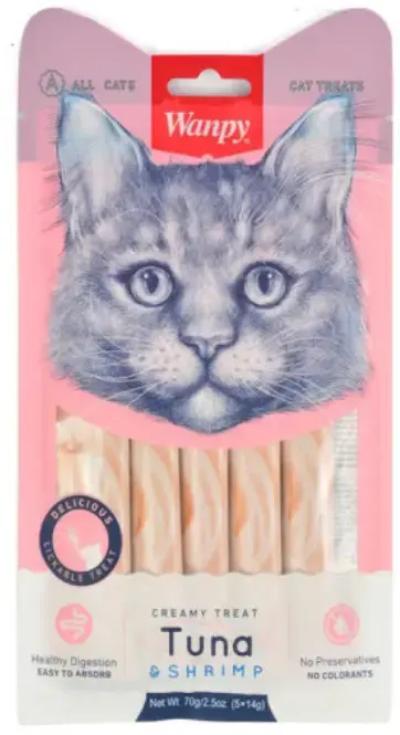 Wanpy Ton Balığı ve Karidesli Sindirim Sistemi Destekleyici Krema Kedi Ödül Maması 14 gr (5’li) , sevimli kedinizin seveceği kremalı kıvamda, lezzetli bir atıştırmalıktır. Ton balığı ve karides aromasıyla zenginleştirilmiş bu özel kremalı ödül, aynı zamanda sindirim sistemini destekleyen prebiyotikler ve kolay sindirilebilir yapıyla kedinizin mide sağlığını destekler.